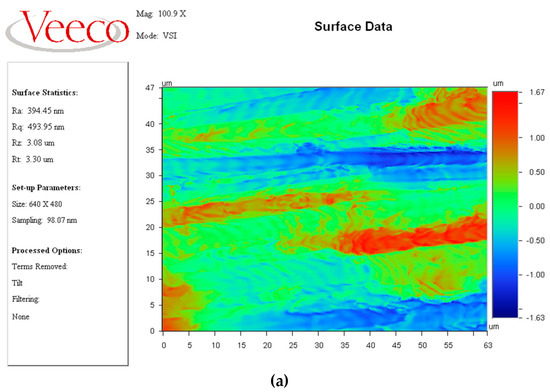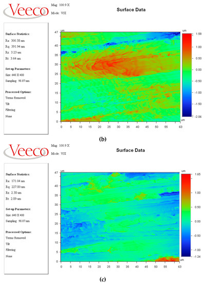 With the development of the high-tech measuring technique [32], the surface roughness of the workpiece was measured with the assistance of the Veeco NT9800 optical profiler (Veeco Instruments Inc., Plainview, NY, USA). It can be seen from Figure 11 that the original surface roughness of the workpiece was approximately 394 nm, and the surface roughness reduced to approximately 300 nm after 3 h of rough polishing. Finally, after the fine finishing process, the surface roughness was approximately 171 nm. It was also noted that Figure 10a–c clearly show changes in terms of surface roughness during the abrasive flow machining process, in which the surface roughness of the titanium alloy artificial knee joint was continuously reduced, and the surface microstructure gradually changed from being obviously uneven to being relatively flat. This indicated that the abrasive flow machining process significantly improved the surface quality of the artificial knee joint surface.
