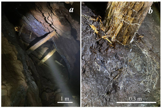 Sampling sites: (a) general view of the abandoned Rogoselga adit, (b) brown rot fungi cords on a damaged wood and carbonate rock.
