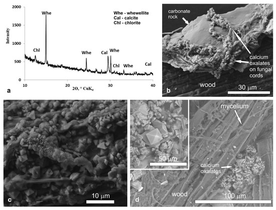 X-ray diffraction pattern (a) and SEM images (b–d) of calcium oxalates in the Rogoselga adit: (b)—underlying substrate (old timber and adjoining carbonate rock) with brown rot fungi and calcium oxalates on fungal cords; (c) numerous small crystals of whewellite and weddellite on fungal cords localized mainly on carbonate rock; (d)—large dipyramidal crystals of weddellite (incut) among numerous small crystals of whewellite on old timber.