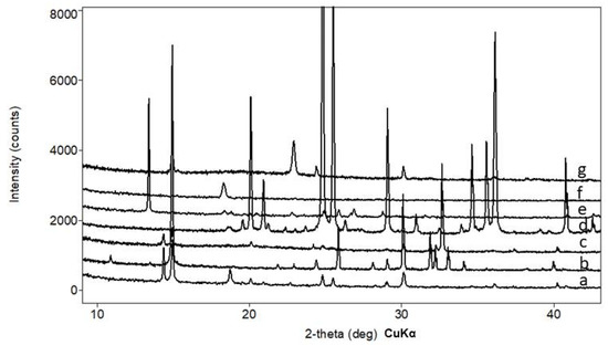 Selected X-ray diffraction pattern of the oxalates crystals (underlying stone substrate’s reflections are also present): a—weddellite and whewellite formed under the action of Serpula himantioides on marble; b—whewellite, Serpula himantioides, fluorapatite; c—glushinskite and whewellite, Serpula himantioides, magnesite; d—anhydrous lead oxalate, Coniophora puteana, cerussite; e—falottaite and lindberghite, Coniophora puteana, hollandite; f—humboldtine, Antrodia xantha, siderite; g—moolooite, Antrodia xantha, synthetic malachite.