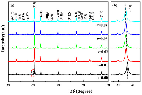 Figure 2 shows the X-ray diffraction results of the Mn/Nb co-doped NBT ceramics, which indicate a typical bismuth oxide layer type structure. The strongest diffraction peak is found to be the (119) diffraction peak for all the samples, in accordance with the previous report that the most intense reflections are (112m + 1) types for the Aurivillius-type ferroelectrics [12]. In addition, a secondary phase of the Bi4Ti3O12 (117) can be detected for all the samples near the diffraction angle 2θ = 30°, which is a common phenomenon in the BLFS [25]. It can be observed that the peaks for Mn/Nb co-doped NBT ceramics shift to the lower angle region with the increase of Mn/Nb contents x, indicating a slight crystal lattice distortion with the introduction of Mn/Nb compound ions into the NBT ceramics. This trend is clearly shown in Figure 2b for the (119) diffraction peak.