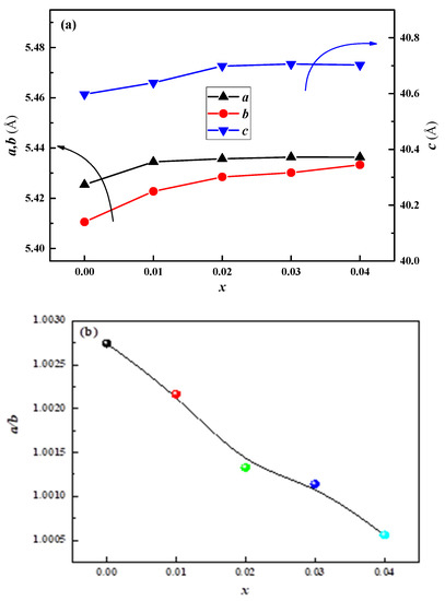 The diffraction peaks shifting to a lower angle region indicate an increasing lattice parameter according to the Bragg diffraction formula. To certify this point, the lattice parameters of the Mn/Nb co-doped NBT ceramics were calculated and illustrated in Figure 3. Obviously, all the lattice parameters increase with the doping level x. It can be explained as follows. In this work, the Mn/Nb co-doped NBT ceramics were sintered at 1100 °C, and the Mn ions and Nb ions will be of the types Mn2+ and Nb5+, respectively. The multi ions of Mn2+ and Nb5+ will enter the B-site of the NBT ceramics as the equal type of (Mn1/3Nb2/3)4+. Due to the larger ionic radius of (Mn1/3Nb2/3)4+ (Mn2+ 0.67Å and Nb5+ 0.64 Å for CN = 6) than that of Ti4+ (0.605Å for CN = 6) [26], the lattice parameters of the B-site Mn/Nb co-doped NBT ceramics will increase as a result. Furthermore, a decreasing a/b ratio with the increasing doping level can be identified in Figure 3b, revealing the decreasing anisotropy in the a-b plane of the Mn/Nb co-doped NBT ceramics.