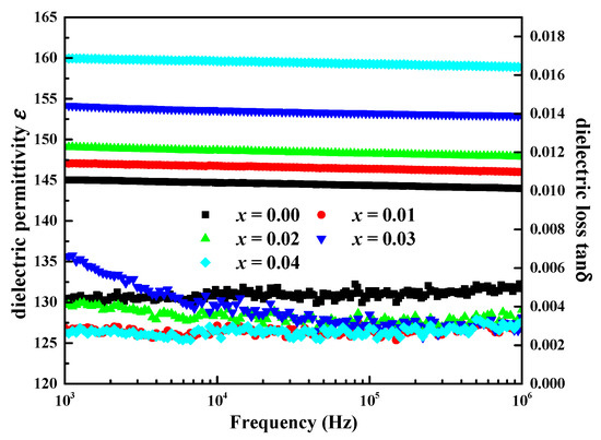 Figure 5 presents the variation of the room temperature dielectric permittivity ε and the dielectric loss tan δ for the Mn/Nb co-doped NBT ceramics in the frequency range of 1 kHz to 1MHz. The dielectric permittivity decreases a little with no obvious dispersion, and the dielectric loss tan δ is lower than 0.006 in the measured frequency range. In addition, it can be figured out that the Mn/Nb co-doped material has a significant influence on the dielectric properties. With the increasing doping level x, the dielectric permittivity increases from 145 to 160, and the dielectric loss tan δ reduced, especially at 1MHz. The optimized dielectric properties may be attributed to the decreasing anisotropy in the a-b plane caused by Mn/Nb co-doping.