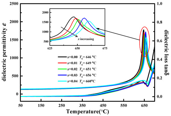Figure 6 shows the temperature dependence of the dielectric permittivity ε and the dielectric loss tan δ at 1MHz for the Mn/Nb co-doped NBT ceramics. It can be clearly seen that a single dielectric peak was detected, which is in accordance with the transition temperature of the ferroelectric phase the paraelectric phase, that is, the Curie temperature (Tc). From the inset, it is obvious that the Tc is sensitive to the Mn/Nb co-doped contents and linearly increases from 646 °C to 660 °C with the increasing doping level x. Generally, the Curie temperature is closely related to the crystal lattice distortion in the pseudo-perovskite blocks (Am-1BmO3m+1)2− in BLSFs. This distortion can be described by the tolerance factor t given by the next equation [27]: