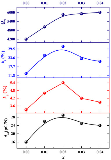 The room temperature electrical properties are measured and summarized in Figure 7. It can be seen that the electrical properties of NBT ceramics are significantly improved by Mn/Nb co-doping, and the piezoelectric coefficient d33 is sensitive to the Mn/Nb co-doped contents, as well as the electromechanical coupling factor k. The maximum of the d33 was found to be 29 pC/N for the NBT-2 ceramics, nearly twice that of the unmodified NBT ceramics. When you compare this improvement in piezoelectric coefficient d33 with that of other NBT based ceramics reported in the past two years, such as the Cr2O3-modified Na0.5Bi4.5Ti4O15-Na0.5Bi0.5TiO3 composite ceramics 25 pC/N [15], the Na0.5Bi4.5-xCexTi4O15 ceramics 20 pC/N [23], the Na0.5Bi4.46Ce0.04Ti4-xCoxO15 ceramics 22 pC/N [28], the (Na0.5Bi0.5)1-xCaxBi4Ti4O15 ceramics 22 pC/N [29], our finding exhibits an obvious advantage, demonstrating that the Mn/Nb co-doping is an effective method to enhance the piezoelectric properties of the NBT-based piezoelectric. In addition, the highest values of the planar electromechanical coupling factor kp and the thickness electromechanical coupling factor kt were also obtained for the NBT-2 ceramics, at 5.4% and 31.2%, respectively, indicating strong anisotropic electromechanical coupling performance due to the two-dimension rotation restriction of the ferroelectric polarization. However, the mechanical quality factor Qm increased linearly from 4200 to 6020 with the increasing doping level x. As discussed before, the Mn2+ and Nb5+ substitute for the B-site Ti4+ because of the close ionic radii. However, the Mn2+ always plays a role in the domain wall pinning in the modification of the piezoelectric ceramics [30,31]. With the increasing Mn/Nb compound ions introduction into the NBT ceramics, the domain wall motion was restricted and the mechanical quality factor Qm increased.