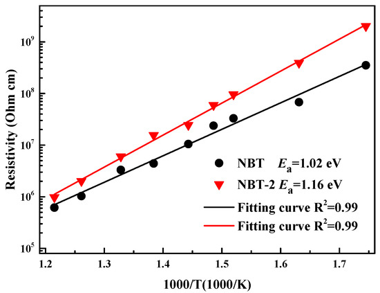 Figure 8 presents the temperature dependence of the DC resistivity of the NBT and NBT-2 ceramics. It can be found that the DC resistivity is enhanced by the introduction of Mn/Nb compound ions into the NBT ceramics during the measured temperature range. According to the Arrhenius relationship ρ = ρ0 exp(−Ea/kT), the activation energies Ea of the NBT and NBT-2 ceramics were calculated and shown in the inset as 1.02 and 1.16 eV, respectively, indicating that the oxygen vacancies dominate the conduction process. This is because the diffusion activation energy of oxygen vacancies in oxide solid solutions is nearly 1 eV. In this work, the enhanced resistivity and activation energy may be attributed to the variable valences of Mn ions. As discussed above, the Mn4+ ions may reduce to Mn2+ ions in the ceramic sintering process. Then the Mn2+ may enter the B-site and replace the Ti4+ because of the similar ion radius. The oxygen vacancies, which dominate the conduction process, will generate as a result. Furthermore, the Mn2+ ions will enhance the domain wall pinning effect [20] and restrict the movements of the oxygen vacancies, leading to higher resistivity. In addition, the DC resistivity of the NBT-2 ceramics is higher than 106 Ω cm at 500 °C, showing potential for high temperature piezoelectric applications.