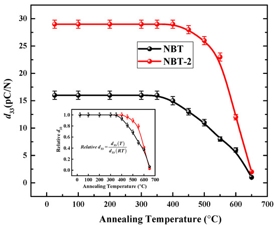 The effect of thermal annealing on the piezoelectric coefficient d33 of the NBT and NBT-2 ceramics has been investigated and shown in Figure 9, and the inset of Figure 9 gives the relative d33 as a function of the annealing temperature. It can be seen that the value of d33 remains unchanged until 400 °C and begins to sharply drop after 500 °C, indicating good thermal stability. In addition, from the insert, it can be seen that the relative d33 of the NBT-2 ceramics decreases slowly and is lower than that of the pure NBT ceramics, demonstrating the enhanced thermal stability of the NBT-2 ceramics. This can be explained as follows. As known, the internal stresses induced during the annealing process led to the depolarization of piezoelectric ceramics. The introduction of Mn/Nb compound ions into the B-site of the NBT ceramics, which causes the lattice distortion, will decrease the internal stresses and result in the enhanced thermal stability of NBT-2 ceramics.