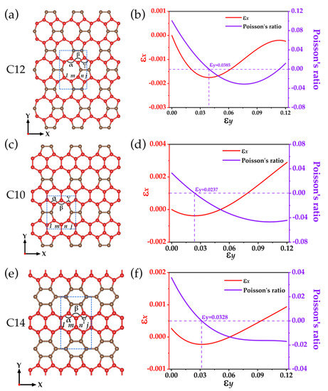 The stability of these materials is verified by the calculated phonon dispersion based on the DFT calculation, which shows that there is no imaginary frequency (see Figure S2 in the Supplementary Materials). Among three structures, the C12, also called OPG-Z, has already been discovered by Su et al. [60]. Based on the MD simulation carried out by Lammps, the curve (red line) and the Poisson’s ratio curve (purple line) are plotted in Figure 3b,d,f. These red and purple lines indicate that a NPR occurs when is equal to 3.85%, 2.37%, and 3.28%. It is demonstrated that under a strain along the y-axis, C10 is the first one to incur a NPR, which has the highest proportion of zigzag chains; while C14 is the last one to show a NPR, which has the lowest proportion of zigzag chains. Moreover, by comparing the bond lengths and bond angles of the carbon chains in these materials, we found that these chains are similar to those in Figure 1 (more details can be found in Tables S1 and S2 in the Supplementary Materials). These results generate a hypothesis that the proportion of carbon chains has a positive correlation with the occurrence of a NPR.