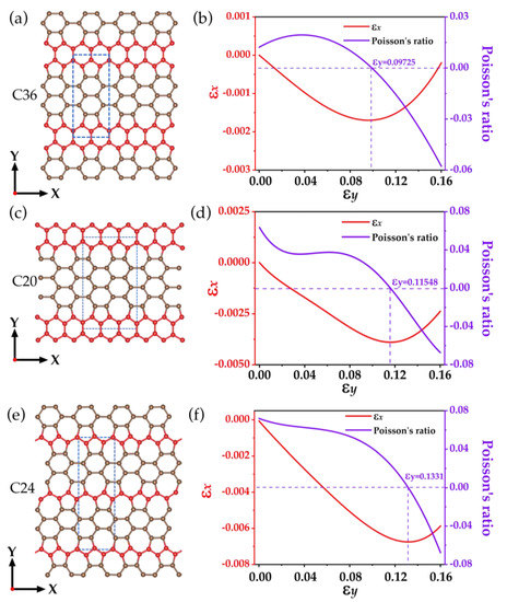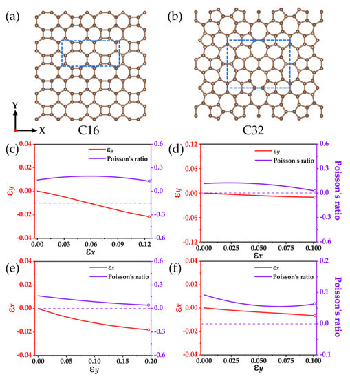 Moreover, as shown in Figure 5, two carbon networks without zigzag carbon chains, marked as C16 and C32, are chosen to compare the mechanical response under strain. The phonon dispersions of C16 and C32 are shown in Figure S2 of the supplementary materials. It is clear that the zigzag carbon chain is absent in both the x- and y-axis. The mechanical response of these two structures is studied when the uniaxial stretch is applied in both the x- and y-axis. As shown in Figure 5c–f, until the structure arrives at mechanical failure, there is no NPR. To return to the structures discussed in Figure 3 and Figure 4, there is no zigzag chain perpendicular to the x-axis. The Poisson’s ratios of these structures along the x-axis are calculated and no NPR occurs, as shown in Figure S3 of the Supplementary Materials. Thus, we conclude that the zigzag carbon chain plays a crucial role in the mechanical properties of 2D carbon materials, and it has a positive effect on the occurrence of NPR. The simulation is processed by the MD method with the Airebo function, and the calculated Poisson’s ratio may be difference under other methods, e.g., DFT [46,47]. However, as shown in Figure S5, these quantitative differences do not influence the qualitative results.