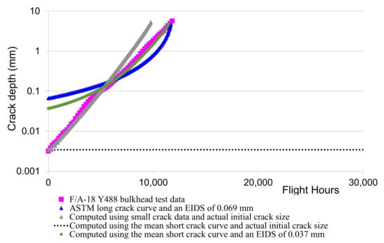 To illustrate this latter point, let us consider cracking in the Boeing F/A-18 Y488 bulkhead, which was an AA7050-T7451 aluminium alloy component, subjected to an operational flight load spectrum, reported in [27,38,39,40]. Figure 1 presents the measured crack growth history given in [27,40,41] for this problem together with the predicted curve obtained using the measured small crack da/dN versus ΔK curve that was also given in [27,38,39,40]. This study also revealed that the crack growth history computed using the long crack da/dN versus ΔK curve and the measured initial crack size was very non-conservative. However, [27] revealed that if an analysis is performed assuming an EIDS of approximately 0.069 mm, then the computed life obtained using the long crack da/dN versus ΔK curve will be in good agreement with the measured test life, see Figure 1. Unfortunately, unlike the predicted crack growth history obtained using the small crack da/dN versus ΔK curve (determined from constant amplitude fatigue tests) and the measured initial crack size, the crack depth history computed using the long crack da/dN versus ΔK curve and an EIDS of 0.069 mm differed markedly from that seen in the test, see Figure 1.