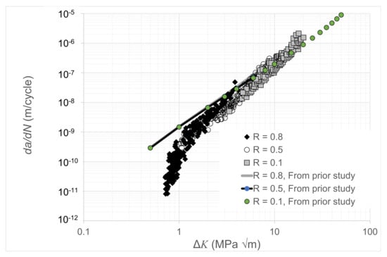 A similar finding was also reported in [45], where it was shown that when using a crack closure-based crack growth equation the analyses performed using the small crack da/dN versus ΔK curve, which was determined under a simple marker-block load spectrum, to compute crack growth under an operational flight load spectrum had to assume an initial crack size that differed from test measurements and/or had to use a modified crack growth equation. (In other words, the methodology presented in [45] could not be used to predict crack growth, and was not consistent with the “building-block” approach mandated in MIL-STD-1530D and JSSG2006.) It was also shown that the measured small crack da/dN versus ΔK curve had little R ratio dependency, see Figure 2. This observation, i.e., the lack of an obvious R ratio dependency is a feature of many short crack da/dN versus ΔK curves, see [46]. Since crack closure is based on the assumption of a R ratio dependency, see Appendix A, this raises a question with respect to the use of crack closure-based equations for durability analyses.
