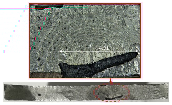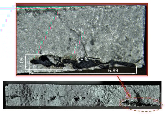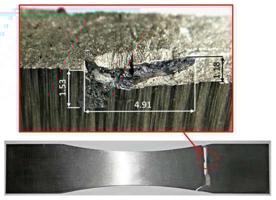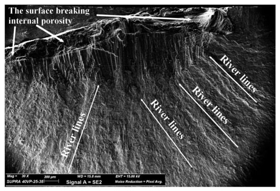 Failure in Specimen 1 was due to cracks that nucleated from the large surface-breaking porosity shown in Figure 4, Figure 5 and Figure 6. It was found that failure occurred as a result of multiple cracks that nucleated along the periphery of the porosity and subsequently linked to form a single macro crack which then led to the failure of the specimen.