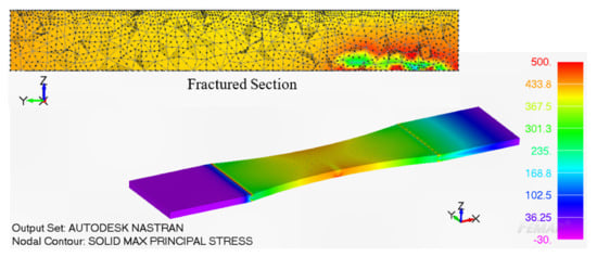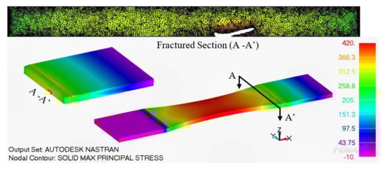 In order to perform the durability analysis of this specimen, the topography of the specimen was measured via the laser scanner to create a CAD model that included both the surface roughness and the surface-breaking porosity, see Figure 7. As in [28], the CAD model was used to create two different finite element (FE) models. This was done to establish that the stress field associated with the finite element model had “converged”. Two different mesh densities were investigated. One had 455,667 nodes and 302,099 ten-noded iso-parametric tetrahedral elements. The other had 3,716,916 nodes and 2,582,879 ten-noded iso-parametric tetrahedral elements. As in [28], both models were created using auto-meshing. The stress fields associated with these two different meshes differed by less than 2.1%. The stress field associated with the fine mesh is shown in Figure 8. Here, it should be noted that since we were only interested in comparing the results of the two different meshes, the analysis used a fixed remote load of 50 kN rather than the load of 29 kN that was used in the experimental test.