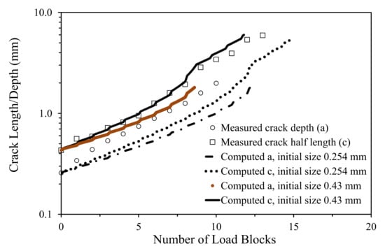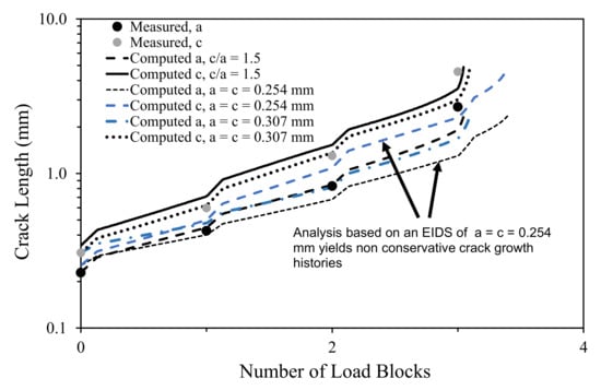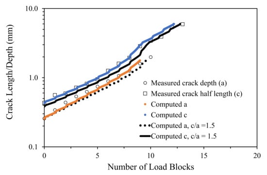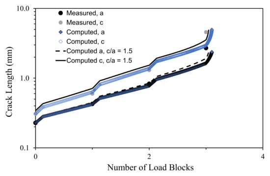 A durability analysis of this specimen was then performed, as per [28], using the fine mesh and Equations (1) and (2) together with the values of the parameters given in [28], viz: D = 2.0 × 10−10, p = 2, A = 150 MPa √m and ∆Kthr = 0.1 MPa √m. (Details of the methodology used in the durability analysis can be found in [28].) The resultant computed and measured crack growth histories, post the mandated minimum equivalent initial damage size (EIDS) of 0.254 mm [4], are shown in Figure 9, where we see good agreement. In this analysis, the aspect ratio of the initial crack were taken to be as measured in the test, namely c/a = 1.67. Here, a is the crack depth, and 2c is the crack’s total length in the direction perpendicular to the crack’s maximum depth.