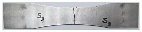 Let us now illustrate the ability of Equations (1) and (2) to predict the durability of a WAAM 18Ni-250 maraging steel specimen with surface-breaking porosity. Whereas the authors’ prior study [28] on the durability of WAAM 18Ni-250 maraging steel specimens focused on specimens with rough surfaces, it was decided to also test a specimen where the surface had been machined flat, see Figure 3. This was to evaluate whether the same durability analysis could be used to predict failure due to cracks that nucleated from surface-breaking porosity. To assist in this goal, i.e., to create surface-breaking material porosity, the build process was modified by lowering the purity of the argon shielding gas, which in turn created defects in the final build. As can be seen in Figure 4, this modification to the build process did indeed result in large surface-breaking porosity.