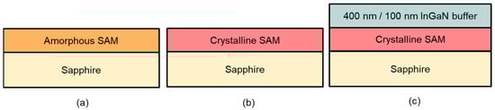 InGaN on SAM on sapphire was achieved following a three-step process. Initially, an amorphous SAM was sputtered onto a sapphire substrate, which was then subjected to crystallization through annealing. Finally, InGaN films were deposited on the crystalized SAM film on sapphire using MOCVD (Figure 1). The amorphous SAM layer was deposited using on-axis radio frequency (RF) magnetron sputtering with a chamber pressure of 2.4 Pa and RF power of 45 W applied on the substrate at room temperature. The crystallization of the SAM layer was accomplished by annealing in a pre-heated furnace in air at different temperatures (1123 K–1223 K) for different time ranges (20–30 h). After annealing, the samples were cooled outside the furnace in ambient air.