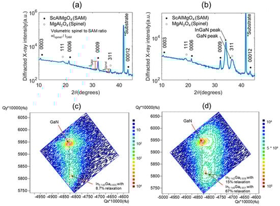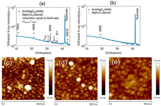 The group III-nitride material system has enabled numerous technologies including electronic and optoelectronic devices. InGaN-based LEDs can be used for emitters of different wavelengths by varying the indium content in the film. A higher indium concentration in the quantum well is required for longer emission wavelengths. An increasing indium content changes their bandgap from 0.7 eV to 3.4 eV, spanning the near IR to near UV range, respectively [1]. One of the most difficult aspects of the InGaN-based material synthesis is its lattice mismatch with the conventionally used GaN buffer layer, which is approximately 11% between GaN and InN [2,3,4,5]. Such a high lattice mismatch results in a high strain, causing dislocations in the crystalline structure and defect generation [1,2]. The use of a relaxed InGaN buffer layer reduces the lattice mismatch between the buffer layers and the active region of the emitters, enhancing the efficiency of the devices [6]. AlInGaP-based red emitters are conventionally used; however, size reduction results in a severe efficiency reduction [7,8,9], which is not a critical concern for nitride-based emitters [10,11,12]. Therefore, there is a critical need for a relaxed InGaN substrate technology. One of the methods to achieve relaxed InGaN is to grow an InGaN buffer layer on a suitable lattice-matched substrate such as ZnO (lattice-matched to In0.22Ga0.78N) [13,14,15,16,17] or ScAlMgO4 (SAM) (lattice-matched to In0.17Ga0.83N) [18,19,20]. Using a modified flexible underlayer to achieve relaxed InGaN has been studied, such as the porosification of Si-doped GaN [21,22,23,24] and thermal decomposition of underlying high-composition InGaN [25,26]. These methods have successfully demonstrated relaxed InGaN buffer layers and achieved different extents of emission redshifts, however, they also had different constraints. Deposition on ZnO requires a very low deposition temperature (<600 °C), porous GaN based substrates require additional fabrication steps, and thermal decomposition of high composition InGaN layer results in an increased dislocation density [14,18,26]. These constraints motivated us to pursue the study of accessible SAM substrates for high-composition InGaN synthesis. SAM has a lattice mismatch of 0% with In0.17Ga0.83N and ~2% with GaN, making it a suitable candidate for hetero-epitaxial growth of III-nitride materials [18,19,20]. The high substrate cost of bulk SAM substrates—USD8900 for 2 in diameter substrates—is quite limiting for academic research [27]. The solid-phase epitaxy (SPE) of amorphous SAM on sapphire followed by crystallization is a cost-efficient way to solve this issue. A problem associated with the creation of thin layers of SAM is that the crystallization of the SAM layer with unoptimized annealing conditions leads to the appearance of scandium-deficient regions on the surface, which lead to the formation of undesirable spinel-phase MgAl2O4 material [28]. The surface roughness of SPE-grown SAM is considerably higher than the other substrate technologies cited before due to its multi-crystallinity. In a previous study, Chen et al. demonstrated the synthesis of epitaxial SAM on a sapphire substrate with a preferred lower temperature of crystallization to constrain the formation of spinel-phase MgAl2O4 [28].