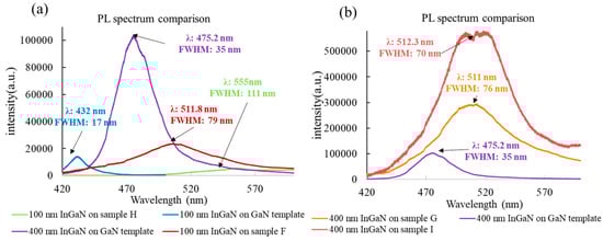 The PL results of InGaN film on SAM on sapphire and the reference GaN on sapphire samples are summarized in Table 3. With a 100 nm InGaN layer grown on GaN on sapphire, a peak wavelength of 432 nm with a PL intensity of around 11,000 arbitrary units (a.u.) was measured, which will be considered as the baseline for comparison of the PL intensity of 100 nm InGaN samples grown on SAM. An increased thickness (400 nm) of the InGaN layer on GaN on sapphire depicted higher indium incorporation, thereby emitting a longer wavelength of 475 nm compared to 432 nm, with an improvement in the intensity (100,000 a.u) of almost ten times. The thick (400 nm) InGaN on GaN on sapphire was the second reference sample for the comparison with thick (400 nm) InGaN grown on SAM. Thick (400 nm) InGaN layer grown on 40 nm SAM (Sample I) produced a two times higher PL intensity, a 1.3 nm redshift in the peak emission wavelength, and a 6 nm lower FWHM compared to Sample G (75 nm of SAM), as shown in Figure 5b. This improvement in the PL emission characteristics could be due to the lower volumetric spinel-to-SAM ratio of Sample I (0.263) compared to Sample G (0.446). Although these two samples showed similar surface roughness measured with AFM, more small-sized grains were formed in Sample I whereas Sample G had larger facets, which might be the reason for the improved crystalline quality and lower FWHM of Sample I compared to Sample G (Figure 4c,d).