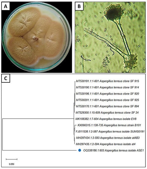 Identification of A. terreus (A–C): (A) fungus culture on PDA medium; (B) head, conidiophore, and conidia under bright field microscopy; (C) phylogenetic tree.