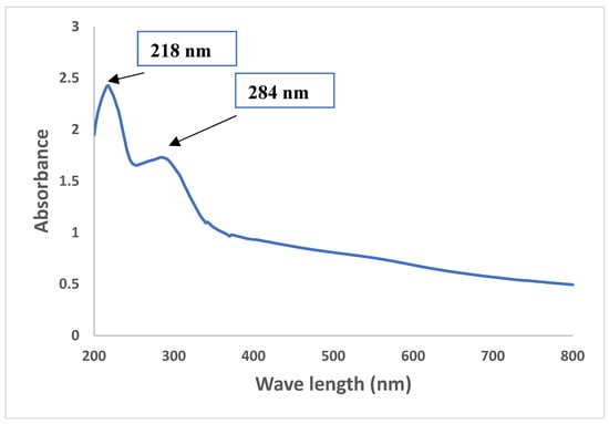 Utilizing UV-Visible spectroscopy, the colloidal solution of SeNPs was examined, and the development of a red color was seen between the wavelengths of 200 and 800 nm for A. terreus extract mediated SeNPs (Figure 2). Two absorption bands at 218 and 284 nm are observed and can be assigned to Se0. The first absorption peak (at 218 nm) may be due to the inter band and core electronic transitions, or lower energy levels to conduction or higher bands. While the second peak (at 284 nm) is a consequence of coherent oscillation of free electrons from one surface of the Se particle to another known as Surface Plasmon Resonance [] absorption []. Generally, SeNPs possess size and shape-dependent properties. Previous studies have shown that SeNPs exhibit a variety of absorption bands in the UV-visible regime due to the applied synthetic protocols and the quantum confinement effect [,,]. The data obtained show the efficacy of fungal extract used as a biocatalyst for the reduction of SeO32− to Se0. SeNPs were synthesized using Acinetobacter sp SW30 showed two absorption maxima at 300 nm and 500 nm []. Moreover, SeNPs revealed a significant absorption peak at 270 nm []. In the case of SeNPs produced by gamma-irradiated Monascus purpureus, the largest SPR peak was noted at 593 nm []. By employing Fusarium oxysporum as a biocatalyst, Islam et al. [] demonstrated that the significant absorption peak at 265 nm suggested the synthesis of SeNPs. The spectra of green SeNPs showed absorbance at 265 nm by using an extract of the endophytic fungus, Nigrospora gullinensis []. The sharp peak of Se-NPs occurred at 295 nm fabricated by Penicillium expansum ATTC 36200 []. Kumar et al. [] used a cell-free extract of Geobacillus to fabricate SeNPs and the SPR band was located at 349 nm. The inconsistency in these results might be due to a particle size variance. It is well established that the SPR bands are very susceptible and highly dependent on the nanoparticles size, shape, Na2SeO3 concentration and the type of substrates presented in the biological extract [].