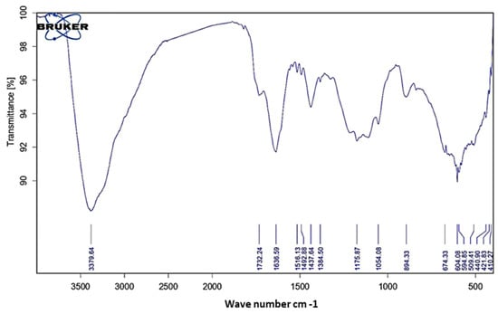 FTIR analysis was employed to examine the interaction between SeNPs and A. terreus supernatant, as illustrated in Figure 3. FT-IR spectra of the biosynthesized SeNPs showed intense absorption peaks at 3379.64, 1732.24, 1636.95, 1516.13, 1492.88, 1437.64, 1384.50, 1175.87, 1054.08, 894.33, 674.33, 604.08, 594.85, 509.41, 440.90, 421.83 and 410.27 cm−1. Peak at 3379.64 cm−1 corresponded to the O–H stretching group of phenols and alcohol or N−H groups of amino acids in proteins [,,]. The peak around 1732 cm−1 corresponds to C=O stretching vibration, while the peaks observed at 1636.95, 1516.13, 1492.88, 1437.64 cm−1 may be corresponded to the binding vibrations of the amide I band of proteins with N–H stretching, or may be attributed to the presence of aromatic substances such as polysaccharides [,]. The shifted one at 1384 cm−1 is attributed to the C–H bending form in the alkanes. The peak observed at 1054.08 cm−1 could represent C–O stretching of aliphatic ether []. The C=C functional group was also observed at 812 cm−1. Absorption peaks around 894.33, 674.33 and 604.08 cm−1 may be due to the partial deuteration of amine or carboxyl group []. Finally, the calcinated SeNPs showed a peak at 509 cm−1 []. These observations indicate the presence and binding of proteins with SeNPs which can lead to their possible stabilization. It is important to understand though, that it is not just the size and shape of proteins, but the conformation of protein molecules that plays an important role []. Therefore, the proteins can interact with nanoparticles through their free amine groups or cysteine residues []. Furthermore, the proteins in the fungal extract might interact with the metal nanoparticles through their free amino or carboxyl groups [].