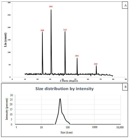 Figure 4A shows the XRD pattern of SeNPs synthesized by A. terreus. Five precise peaks were detected at 2θ degrees: 23.92° (100), 30.8° (101), 41.84° (111), 51.44° (201), and 66.64° (210) confirmed the crystalline phase of Se. Peaks observed at different 2θ values exhibited a monoclinic structure of SeNPs. The sharp peak at 2Ɵ = 30.8° (101), which showed significant orientation to the examined facet (101) and excellent purity of SeNPs after preparation, indicated that significant orientation had occurred. Debye-Scherrer equation was used to determine the average NPs size determined by XRD examination. The average SeNPs size obtained was 76.58 nm, and the FWHM (2θ) value was 0.11243. These agree with the results reported by Hashem et al. [] which the average particle size ranged from 3 to 82 nm. Consistent with our findings, Al Jahdaly et al. [] reported that the average size of SeNPs synthesized using green technology, as obtained by XRD analysis, was 37 nm. Hassanien et al. [] calculated by XRD the average particle size of SeNPs synthesized by the M. oleifera aqueous extract was 18.85 nm.