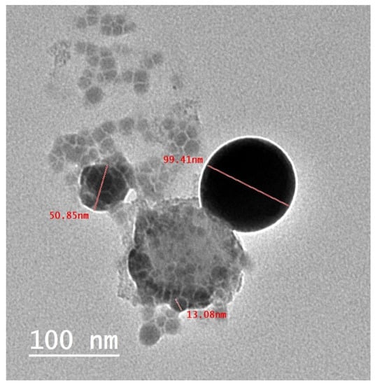TEM was used to examine the morphological characteristics of the NPs and their approximate size. The TEM analysis showed that the synthesized nanomaterial is spherical with a diameter of 10–100 nm (Figure 5). A study reported by Kumar et al. [] showed that the synthesized nanomaterial is spherical with a diameter of 30–60 nm. Hassanien et al. [] reported success in the formation of Se-NPLs from M. oleifera extract that were monodispersed in nature, spherical in shape, and ranged in size from 23 to 35. TEM analysis confirmed that biosynthesized SeNPs with unique structures could be produced using the substances present in FBF from A. terreus []. Further, the small size of the SeNPs synthesized in this work has the potential to be used in various biotechnological applications that depend on the NPs size.