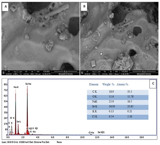 Scanning electron microscopy was used to examine the morphological characteristics of green SeNPs. Accordingly, the green SeNPs had microsphere-shaped nanoparticles with a smooth surface, as displayed in Figure 6A,B which is the predominant shape of SeNPs agreed by reporting studies []. The scanning electron micrograph also revealed that the powder form particles are slightly agglomerated. A Few SeNPs were observed to be clustered to form larger particles. This result was in accordance with the SeNPs obtained in previous work []. The EDX profile of SeNPs confirmed the presence of Se element. According to the EDX profile (Figure 6C), the Se element is present at the weight percentages of 36.9%. The weight percentages of C, Cl, and Na are 18.9%, 6.5%, and 25.9%, respectively. The highest atomic percentages were for C (35.5%) followed by Se (33.8%).