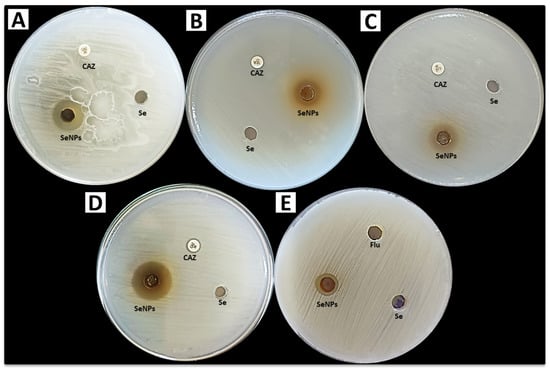 Antimicrobial impedance, which harms human health and increases the risk of diseases and the death rate associated with serious, life-threatening diseases, is currently the biggest health danger in every country in the world. Consequently, researchers studying the antibacterial effects of plants on bacteria that are resistant to several drugs are doing so in novel ways []. The use of SeNPs in the biomedical area has been increasing as an alternative to the growing bacterial resistance to antibiotics []. Inorganic Se has been shown to be highly harmful to humans when doses higher than the advised levels (0.07 mg/day for men and 0.06 mg/day for women) are consumed []. On the contrary, SeNPs represent a novel transport method and nanomedical application that minimizes potential harm to the organism []. Given that it has been demonstrated to possess antioxidant and antibacterial qualities, it could be utilized to treat a variety of ailments, including cancer, diabetes, and illnesses brought on by viruses and bacteria []. Because green nanoparticle synthesis is more affordable, environmentally benign, and produces a non-toxic substance that may be employed in a variety of medical applications, particularly in preventing the spread of antibiotic-resistant bacteria, it is preferred to chemical and physical processes. In the current study, mycosynthesized SeNPs were tested for antimicrobial activity against Gram-positive and negative bacteria, as well as unicellular fungi, using the agar well diffusion method, as shown in Figure 7. Our results revealed that, mycosyntesized SeNPs using A. terreus exhibited promising antibacterial activity against Gram-positive and Gram-negative bacteria, where inhibition zones were 14, 20, 16 and 13 mm toward S. haemolyticus and S. aureus, E. coli and K. pneumoniae respectively as shown in Table 1. Also, mycosyntesized SeNPs had weak antifungal activity against C. albicans where inhibition zone was 12 mm (Table 1). On the other hand, CAZ, Flu and Se+ did not exhibit any activity on all tested bacterial and fungal strains. According to a previous study, B. subtilis, S. pneumoniae, B. cereus, E. coli, P. mirabilis, and K. pneumoniae could all be effectively stopped from growing when SeNPs was used. B. subtilis had the largest zone of inhibition (19 mm), followed by E. coli (15 mm), B. cereus (14 mm), S. pneumoniae (13 mm), and P. mirabilis (11 mm) []. In another study, the antifungal activity of SeNPs was assessed, and the inhibition zones for A. niger and A. flavus were 20 and 18 mm respectively, C. albicans did not show any discernible effects []. The creation of reactive oxygen species (ROS), breakdown of the bacterial cell wall, and suppression of protein and DNA synthesis are only a few of the potential modes of action for SeNPs [].