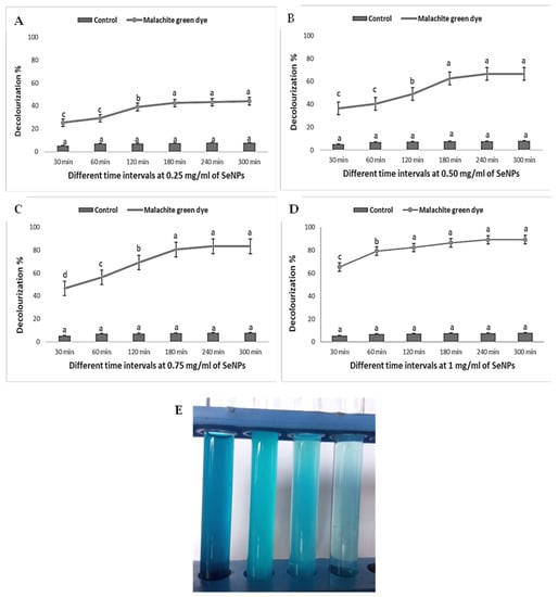 Decolorization percentages (%) of malachite green dye at different concentrations of SeNPs 0.24 (A), 0.5 (B), 0.75 (C), and 1 mg/mL (D); and the change of color removal of MG dye at different times (E). Letters a, b, c, d Mean significance power.
