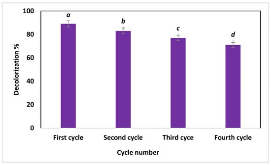 The photocatalyst stability or reusability is the critical factor for integration into industrial applications. In the current study, the reusability of green synthesized SeNPs in the photodegradation of malachite green dye was achieved under optimum conditions (in the presence of light irradiation at a concentration of 100 ppm of dye, 1.0 mg mL−1 SeNPs for 240.0 min). The reusability test was measured for the fourth cycle. Data analysis revealed that the activity of the catalyst was decreased and measured after four cycles. The photodegradation of malachite green dye was 89% after the first cycle and decreased to 71% after the fourth cycle (Figure 9). These reductions in photocatalyst activity can be related to the saturated sites that exist on the surface of catalysts with small intermediate biodegradable compounds []. Fouda et al. [] reported that the photodegradation was reduced from 89% after the first cycle to 86% after the fourth cycle of crude textile wastewater. Based on the obtained data, it can be concluded that the high stability of green synthesized SeNPs enhanced the photodegradation of malachite green dye for different cycles.
