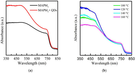 Absorbance spectrum of (a) MAPbI3 film without and with doped CsPbI3 QDs and (b) the RTA-treated PQD films at the various temperatures from 100 to 160 °C.