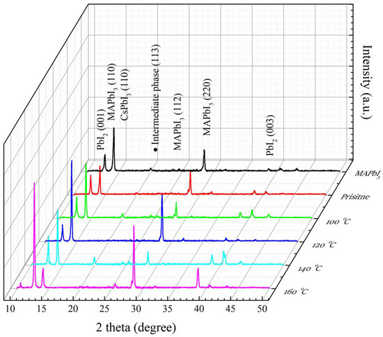 In Figure 3, the MAPbI3 and PQD films were analyzed using XRD at different annealing temperatures (100–160 °C). The main peaks of (110) and (220) are observed at 14° and 28° of 2θ, respectively [40,41]. A few minor peaks at (001) and (003) are observed at 12.7° and 38.7°, respectively [42,43], which are usually identified as a PbI2 phase caused by the degradation of MAPbI3 films. Some slight peaks at (113), (112), and (PbI2) in the range of 20°–25° are determined as the intermediate phase during the crystallization process [39]. The decreased intensity of the main (110) peak of the MAPbI3 films induced by CsPbI3 QDs is owing to the existence of a residual ligand (oleylamine) after doping [44], leading to a decrease in the crystallinity of the films. This residual ligand can be effectively removed via the RTA process, revealing the enhancement of the intensity of the (110) peak of the RTA-treated PQD films at 100 and 120 °C. The decreased intensity of the (220) peak at 100 °C may possibly be due to the insufficient cation exchange with the lack of thermal energy. Therefore, the temperature of 120 °C inhibits PbI2 formation, corresponding to the weakened intensity of the (001) peak and resulting in the significant enhancement of the (220) peak of the MAPbI3 films and the better crystallinity of PQD films. However, the temperatures of 140 °C cause the sharply increased intensity of the (001) peak of PbI2. The reason is attributed to the decomposition of MAPbI3 and CsPbI3 QD films. It is found that the degradation of the PQD film annealed by the high temperature in an atmospheric environment demonstrates PbI2 formation, which is consistent with the above description. However, the existence of an oxygen atom is another reason to cause the degradation of PQD films.