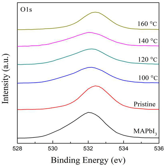 The chemical features and element compositions of RTA-treated PQD films at different temperatures of 100–160 °C were investigated using XPS measurement. Figure 4 illustrates the spectra of the O 1s core level in the range of 528–536 eV to research the oxidation of PQD films induced by their hygroscopic nature. It is obviously found that a peak of the MAPbI3 film at 532.04 eV shifts to that of the higher binding energy of PQD films at 532.5 eV. This shift of ~0.5 eV may be due to the residual ligands caused by crystalline defects in turn bonding to oxygen atoms. It is clearly observed that with the increasing RTA temperatures from 100 to 140 °C, there is a decrease in the shift to a lower binding energy at 531.9 eV due to octahedral tilting after doping with cations, further stabilizing the structure and promoting thermal stability [45]. A shift to a higher binding energy at 160 °C is owing to the degradation of the surface of the PQD films, leading to the existence of the PbI2 phase, which is in agreement with the XRD results.