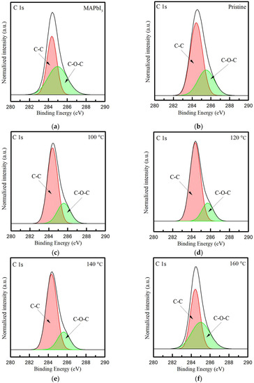 Therefore, in order to understand the binding state of the oxygen and carbon atoms in films, in Figure 5, the spectra of the C 1s core level of PQD films at different annealing temperatures were detected (see Figure 5c,f). It is observed that these peaks are located at ~284 eV, despite there being an asymmetric shape observed near higher binding energies. Thus, the peaks of C 1s are further deconvoluted into two major peaks, which are assigned to 284.4 and 285.4 eV. These two peaks are typically presented as the bonding of C-C and C-O-C, respectively [46,47], which is caused by the resulting oxidation of PQD films in the atmospheric environment. The peak areas of the C-C and C-O-C bonding are calculated in Table 3. It is observed that the doping with CsPbI3 QDs contributes to the decreased content of C-O-C bonding, owing to the decreasing value from 49 to 31.8%. Meanwhile, this value gradually decreases with the increasing RTA temperatures and shows the lowest value of 20.1% as the RTA-treated PQD film is annealed at 120 °C. As for temperatures higher than 120 °C, the values at 140 and 160 °C increase to 21.1% and then the highest, 46%. Therefore, this high temperature of 160 °C causes oxygen diffusion with a direction from the film to the annealing atmosphere, which can be visibly observed as yellow crystals. These results indicate that the appropriate annealing temperature of 120 °C can effectively reduce the binding of oxygen to carbon in PQD films, further improving crystallinity.