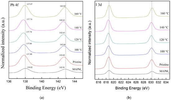 The XPS spectra full-wide scan of (a) the Pb 4f and (b) the I 3d core level of all samples, including the MAPbI3 films and PQD films without (pristine one) and with the RTA treatment at various temperatures in the range from 100 to 160 °C. The deconvolution results are referred to in previous research [23,26].