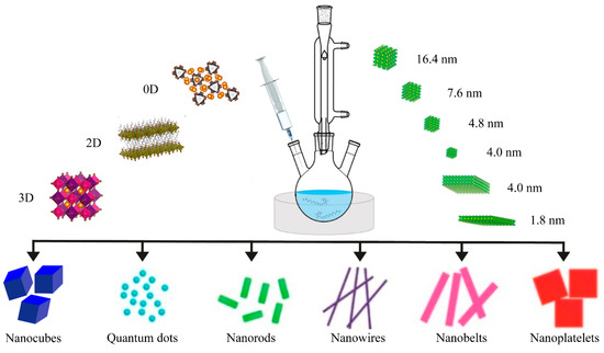 So, the hot injection technique is producing different nanostructures of PeNCs with the sizes of 2–20 nm (by using, for example, OLA and OA as ligands), which mainly depend on the injection temperature and the ratio of the precursors (Figure 3).