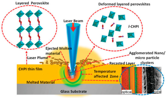Kanaujia et al. demonstrated the possibility of direct femtosecond laser ablation (λ = 410 nm, P = 100 mW) of 2D inorganic-organic cyclohexenyl ethyl ammonium lead iodide ((C6H9C2H4NH3)2PbI4) films (thickness ≈ 135 nm) where perovskite micro- and NPs have been obtained as a by-product of laser writing (Figure 4). During the laser-material interaction, once the thin film melted, the material ejection occurred and formed a plasma plume that consisted of perovskite nano- and microparticles, which condensed at the nearby surface due to the temperature gradients and gravitational pull. The diameter of the obtained particles varied from 500 nm to 1 micron in size [48].