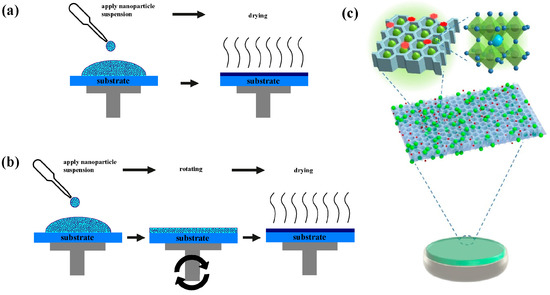 In the case of PeNCs ECL studies, their deposition on the electrode surface also plays a crucial role in enhancing NC stability in polar media, especially in aqueous solutions. There are two most common methods to obtain functional thin films with NPs for ECL measurements: drop-casting and spin-coating techniques. The drop-casting method (Figure 5a) consists of two stages: deposition of the drop of a liquid solution containing a suspension of NPs and drying of the surface from the solvent [59]. The spin-coating technique includes the following stages: applying the solution with particles, rotating the electrode surface, and drying (Figure 5b) [60]. Despite the apparent similarity of these methods, the spin-coating method facilitates the production of uniform thin films, with the thickness of micro- and nanometers and uniform distribution of NPs over the surface of the electrode.