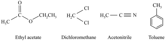 For the ECL with PeNCs, the following solvents were used in the observed articles: ethyl acetate (EA) [37], dichloromethane [24], acetonitrile [56], or acetonitrile/toluene mixture solution [25] (Figure 6). Some solvents can act not only as an electrolyte solution but as a coreactant. Ethyl acetate is a non-polar organic solvent that is used not only as an electrolyte solution but also as a coreactant for the ECL reaction with a potential window between 0 and 1 V. Application of EA helped to achieve efficient ECL of CsPbBr3 PeNCs [37].
