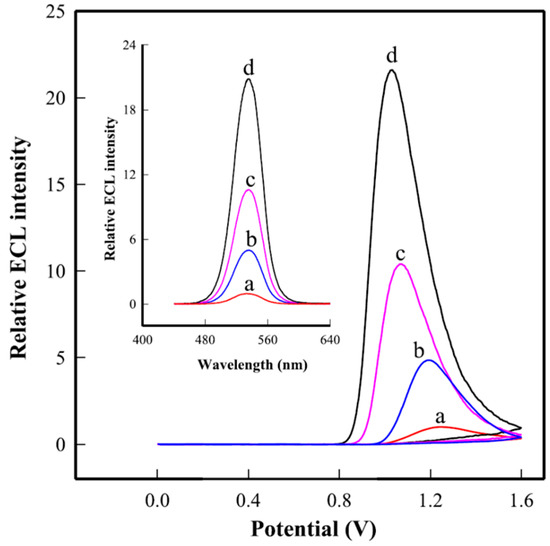 Anodic ECL profiles of FAPbBr3 NC/GCE (a), TiO2 NPs@FAPbBr3 NC/GCE (b), FAPbBr3 NC@CNT/GCE (c), and TiO2 NP@FAPbBr3 NC@CNTs/GCE (d) in pH 7.4 PBS containing 0.2 M KCl and 15 mM TPrA. Inset: oxidative-reduction ECL emission spectra. Reproduced with permission from Ref. [58]. © Elsevier.