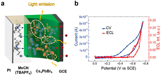 (a) Schematic drawing of Cs4PbBr6/GCE modified electrode and the light generation process therein. (b) ECL (Red curve)—CV (Blue curve) simultaneous measurements of Cs4PbBr6/GCE in the presence of 50 mM BPO as the coreactant by the pulsing potential from approximately 0.0 V to −0.75 V. Reproduced with permission from Ref. [24]. © Royal Society of Chemistry.