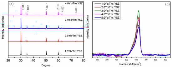 (a) XRD patterns for powders that were obtained by grinding x Yb/Tm: YSZ single crystals, (b) Raman spectra of x Yb/Tm: YSZ single crystals.