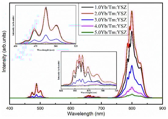 Up-conversion luminescence spectra for x Yb/Tm: YSZ crystals excited at 980 nm.