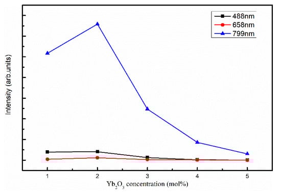 Figure 6 shows the intensities of the emission peaks of the samples. The luminescence intensity increases with an increase in Yb2O3 concentration up to 2.0 mol%, and then decreases dramatically, due to the concentration quenching effect. According to the Blasse theory, the process of non-radiative energy transfer depends on the radiative reabsorption or the electric multipolar interaction of the activated ion. However, the radiation reabsorption process only occurs in the case of a large overlap between the excitation spectrum of the sensitizer and the emission spectrum of the activator. As can be seen in Figure 4, the emission peaks of Tm3+ are located at 488, 658, and 799 nm, while the absorption peak of the Yb3+ is located at around 980 nm, and the peak overlap is very small. Therefore, the concentration quenching in Yb/Tm: YSZ single crystals is induced by the electric multipolar interaction.