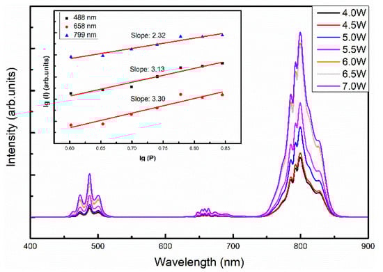 To examine the up-conversion mechanisms, the emission spectra of (0.5 mol%Tm2O3, 2.0 mol%Yb2O3): YSZ single crystal under 980 nm excitation at different power are plotted in Figure 7. The luminescence intensity (I) increases with the power (P), following the multiphoton formula, I ∝ Pn. Here, n is the number of photons to populate the emitting states and is obtained by the slope of the linear fits of lg I-lg P curves. The slopes are 3.13, 3.30, and 2.32 for the blue emission centered at 488 nm, red emission centered at 658 nm, and NIR emission centered at 799 nm, respectively. This indicates that the red and blue emissions involve three photons while the NIR emission needs two photos. Although a photo avalanche (PA) is a possible mechanism for up-conversion luminescence, it is excluded because no inflection was observed in the power curve. Therefore, the up-conversion luminescence of Yb/Tm: YSZ single crystal is realized by the energy transfer (ET), the ground state absorption (GSA), and the excited state absorption (ESA) processes.