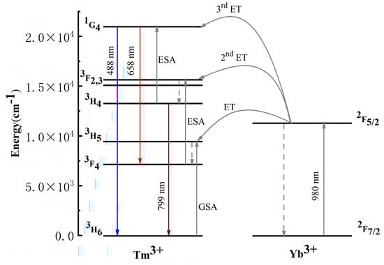 As the emitted photon energy is greater than that of the excited ones, the energy levels between the activator and the sensitizer have to be very close to realize the continuous absorption of photons and energy transfer in the up-conversion luminescence process. Among the trivalent rare earth ions, Tm3+ is an important up-conversion luminescence activator. It has a ladder-like schema of energy level, and its 1D2→3F4 and 1G4→3H6 transition wavelengths are around 450 and 480 nm, respectively. The blue up-conversion luminescence process of Tm3+ can be excited under the pumping at 650, 800, and 980 nm. Tm3+ has been extensively studied due to its suitability for commercial InGaAs (940–990 nm) laser diode pumping. Yb3+ has the electronic configuration of 4f13, and its energy state structure only contains one excited state(2F5/2), which is slightly higher than the metastable excited state of Tm3+ (3H5). Besides, Yb3+ has a strong absorption cross-section at 980 nm. The effective energy transfer can occur between Yb3+ and Tm3+, achieving efficient up-conversion luminescence. The co-doping of Yb3+ and Tm3+ can substantially improve the up-conversion luminescence efficiency [8,9,10,11,12], which was widely adopted in investigating and utilizing light radiation.