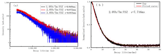 Figure 9a presents the fluorescence decay curve of the emission line 1G4→3F4 (658 nm) of Tm3+ in x Yb/Tm: YSZ crystal (x = 1.0, 2.0, 3.0 mol%), excited by 980 nm at room temperature. From a single exponential function fitting, the average fluorescence lifetime τ of the 1G4→3F4 transition of the x Yb/Tm: YSZ crystal (x = 1.0, 2.0, 3.0 mol%) is equal to 0.949 ms, 0.972 ms, and 0.953 ms, respectively. The 2.0Yb/Tm: YSZ single crystal has the longest lifetime. As the concentration of Tm3+ remains the same, the excited state lifetime of Tm3+ is affected by the energy transfer process between Yb3+ and Tm3+. In addition, the fluorescence decay curve for Tm3+ for the 1G4→3H6 (488 nm) transition in 2.0Yb/Tm: YSZ single crystal is shown in Figure 9b. The average fluorescence lifetime is 7.716 ms. The decay time is larger than that of Tm: LGYSO [37] (1.669 ms), Tm: YVO4 [38] (1.9 ms), Tm: SSO [39] (1.14 ms), revealing the suitability of the YSZ crystal as a host material for luminescence of Tm3+.