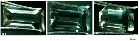 The common colorless, yellow scapolites on the market were selected. Samples were from the original stone suppliers. Yellow scapolites were from Mozambique in Africa, and colorless scapolites were from Madagascar. The sample numbers were cl-1~3 and y-1~15, respectively. As shown in Figure 1 and Figure 2, the colorless samples are carved gems, and the yellow are the original stones. The colorless samples are smaller in size, and the yellow samples are larger. Each sample has at least one polished surface.