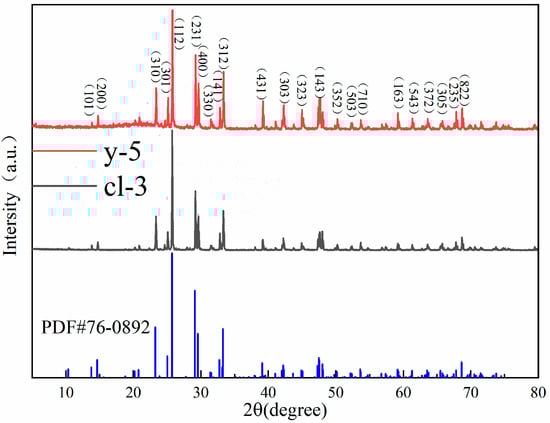 As shown in Figure 5, the XRD patterns of colorless and yellow scapolite are basically consistent with the standard card PDF # 76-0892. This indicates that there is no structural difference between scapolites of different colors. The XRD peak of the sample is sharp, which indicates that scapolite has high crystallinity. The strongest diffraction peak of scapolite is 25.779° in 2-Theta, followed by 23.367°, 25.100°, 29.264°, 29.652°, 32.833°, and 33.350°. In addition, there is a densely arranged diffraction peak group between 47° and 48.5°. The space group of yellow scapolite y-5 is P42/n, the unit cell parameters are a0 = b0 = 1.2060 nm, c0 = 0.7579 nm, α = β = γ= 90°, and the unit cell volume is 1.10241 nm3. The space group of colorless scapolite cl-3 is P42/n, and the unit cell parameters are a0 = b0 = 1.2045 nm, c0 = 0.7564 nm, α = β = γ = 90°, and the unit cell volume is 1.09728 nm3. Elena et al. found that the unit cell parameter a0 in scapolite is positively correlated with the value of Me% [24]. Therefore, the reason for the unit cell parameters between the two scapolites is the different Me% values. According to the results of XRF and EPMA, the Me% value in yellow samples is higher than that in colorless samples, so the a0 value of y-5 is higher than that of cl-3.